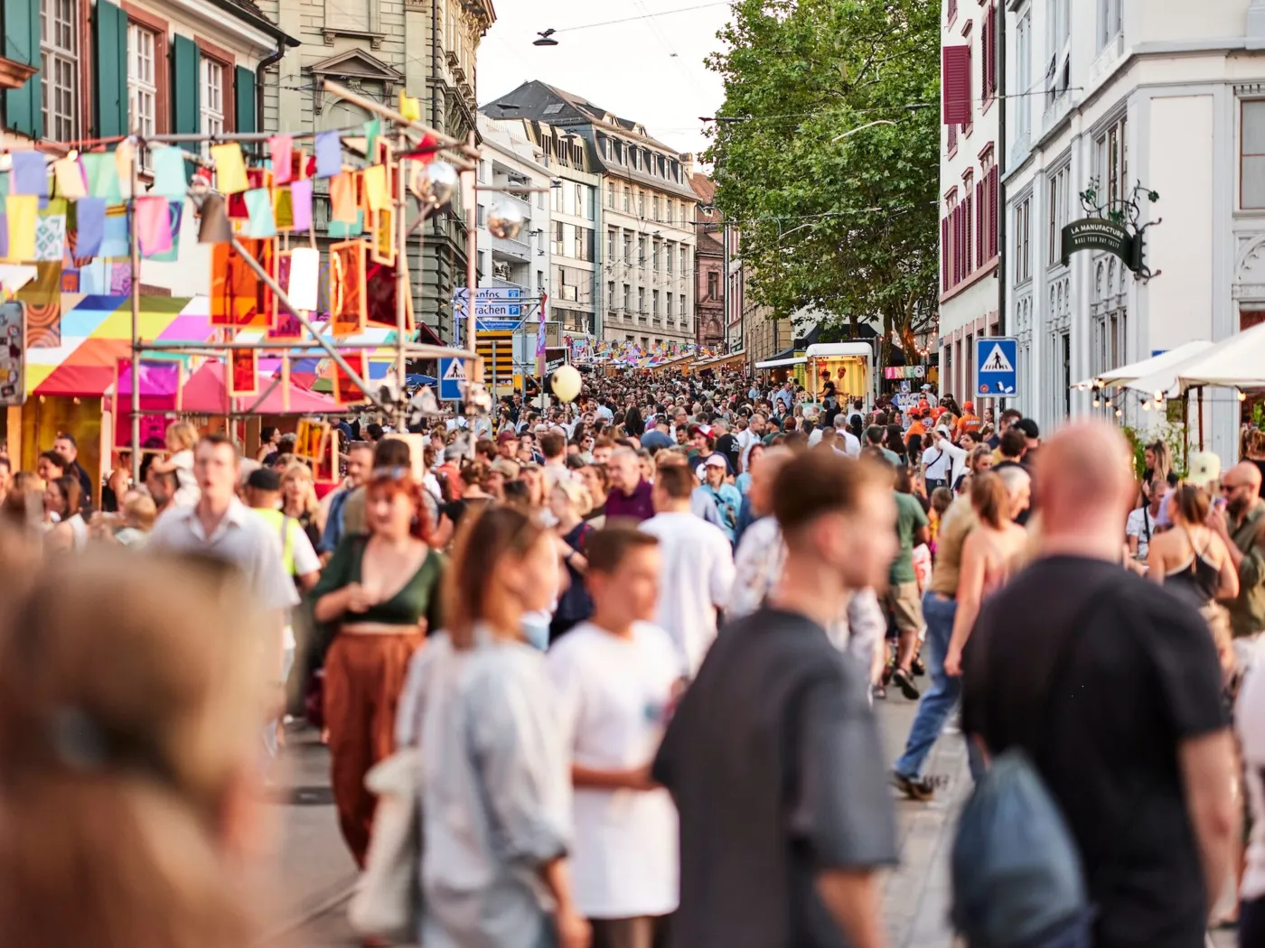 2019 war schliesslich die Zeit gekommen, die schützende Kuppel der Markthalle zu verlassen und den Stadtraum aufzumischen. Das Flâneur begab sich mitten ins Getümmel und verwandelte die Clarastrasse in einen unerwarteten und sonderbaren Ort. Über 20'000 Besuchende hauchten dem Festival Leben ein und begannen, im Stadtraum zu flanieren. Nach zwei Jahren pandemiebedingter Pause kam das Flâneur 2022 an der Falknerstrasse zurück – über 50'000 Menschen freuten sich. In den letzten Jahren schliesslich wurde die Elisabethenstrasse zum Zentrum des Spektakels. Hier wurde endgültig klar: Das Flâneur Festival ist mehr als ein x-beliebiger Event. Es ist ein Gefühl. Eine Bewegung. Die Stadt wird zur Bühne, die Besuchenden sind Teil einer grossen, friedlichen Gemeinschaft. Einer Gemeinschaft mit unterdessen an die 100'000 Menschen, unter ihnen ein neues, junges und urbanes Publikum.